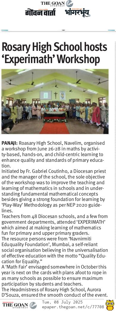 Rosary High School, Navelim, organised a workshop from June 26-28 in maths by activity-based, hands-on, and child-centric learning to enhance quality and standards of primary education.
